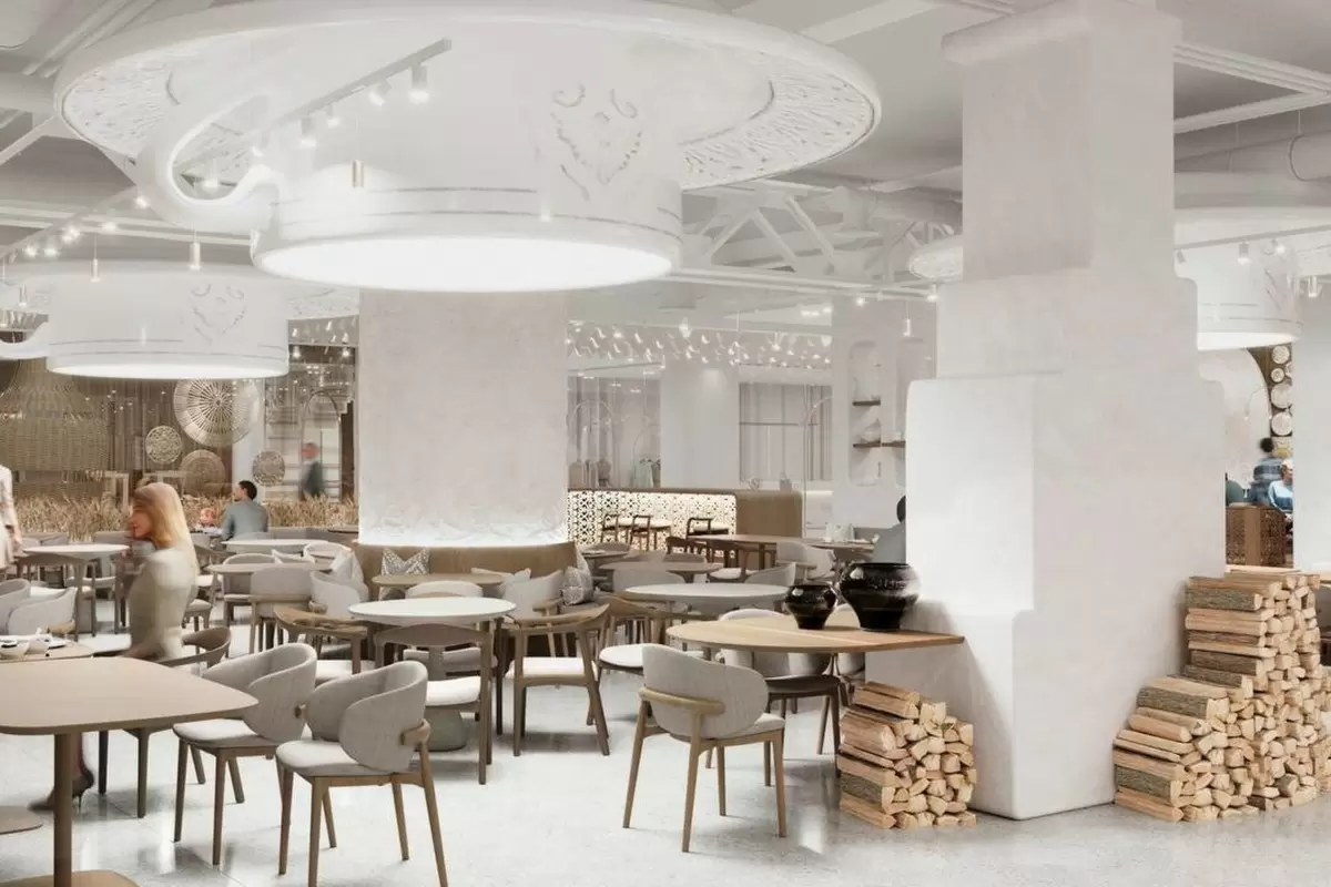 Одной из ключевых идей фуд-корта станет сохранение татарского культурного наследия. Валеева отметила, что в нем появятся зоны, напоминающие о традиционных татарских деревнях. В интерьере будут использоваться элементы, характерные для местных архитектурных стилей, такие как стилизованные ворота и элементы резьбы по дереву, вдохновленные настоящим деревянным домом из Буинского района.