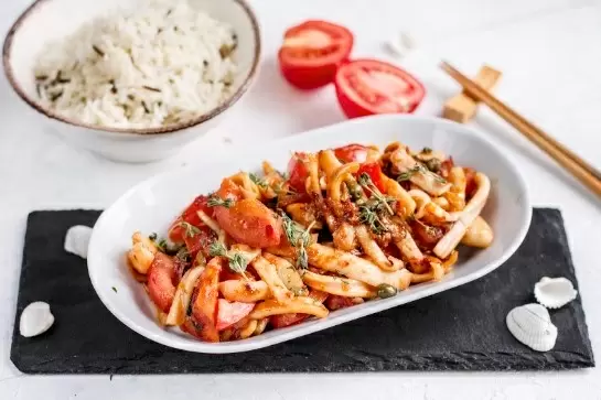 Шаг 2: Разогрейте сковороду и добавьте немного растительного масла. Положите в сковороду кальмары и обжаривайте их по 30 секунд с каждой стороны на сильном огне. Далее добавьте сладкий соус Чили, чеснок, помидоры, тимьян, маслины и каперсы. Все тщательно перемешайте и прогревайте еще минуту, пока не почувствуете возбуждающий аромат. Приправьте по вкусу солью и перцем. Подавайте на теплой тарелке, сбрызнув оливковым маслом. Блюдо готово к моментальному наслаждению!