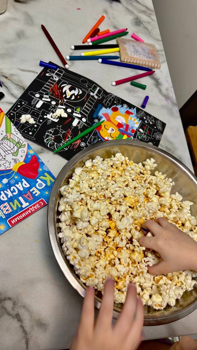 - Сегодня было приготовлено много попкорна — идеальное угощение для уютного вечера.
