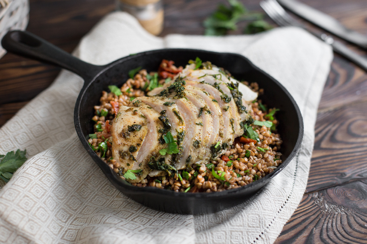 Этап 3: Вяленые томаты нарезать соломкой, мелко порезать оставшийся зубчик чеснока и петрушку. Готовую гречку сделать еще более вкусной, смешав с сливочным маслом, вялеными томатами, чесноком и петрушкой (не забыть оставить немного для украшения). На тарелке разместить порцию гречки и нарезанную индейку, украсить зеленью и подавать к столу.