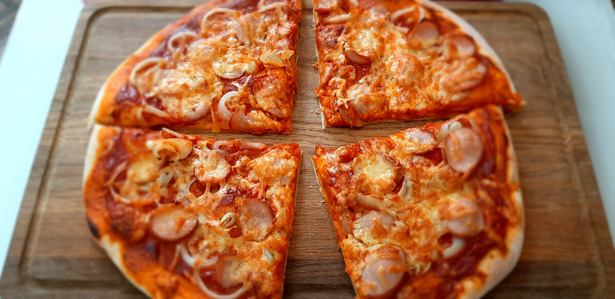Когда тесто поднялось, раскатайте его в лепёшку и выложите на противень. Не забудьте распределить соус, уложить лук и сардельку, а сверху посыпать тертым сыром. Выпекайте в заранее разогретой до 220 градусов духовке в течение 25-30 минут. Если хотите, добавьте сыр за 5-10 минут до окончания выпекания для идеально тянущегося эффекта.