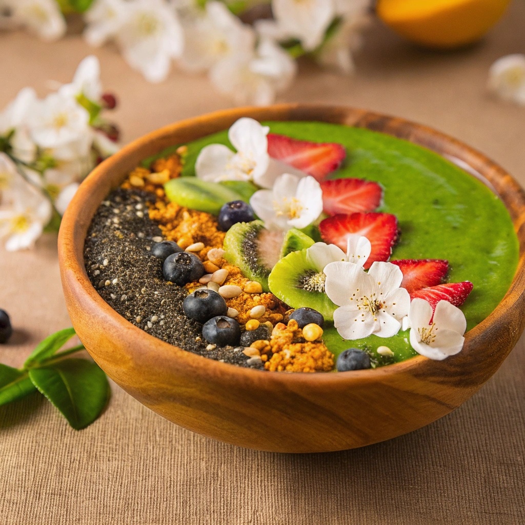 Смешайте шпинат, банан, киви и миндальное молоко в блендере до однородной массы. Перелейте получившуюся массу в чашу и украсьте ягодами и гранолой — это идеальный старт к весеннему дню!
