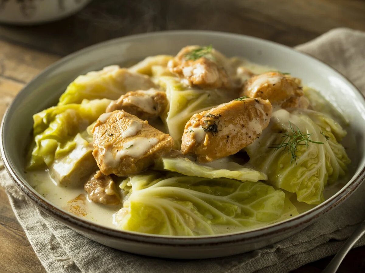 Приготовление: Нарезать курицу кубиками и обжаривать до белого цвета, затем добавить лук и жарить еще минуты. Капусту шинкуем крупно, добавляем к курице, перемешиваем, вводим сливки и специи. Накрываем крышкой и тушим на среднем огне 10 минут, в конце добавляем чеснок.