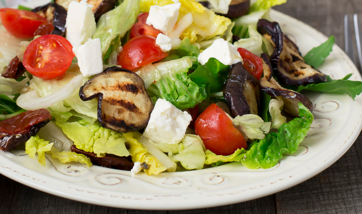 Сочетание свежего хрустящего зеленого салата, обжаренных баклажанов, сладких помидоров и нежного сыра фета создаёт невероятно вкусное и сытное блюдо. Пикантная заправка с легким чесночным послевкусием придаёт всему исключительный шарм.